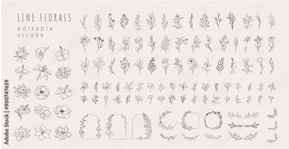 Set of different flowers, brunch and frames from flat editable stroke. Luxury line floral collection for wedding invitation art, design template. Botanical vector #900747659