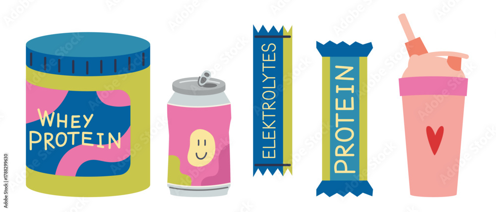 Set of fitness supplements including whey protein, protein bar, electrolyte drink, and shaker bottle. Trendy modern vector illustration isolated on white background, hand drawn, flat design #1788299630
