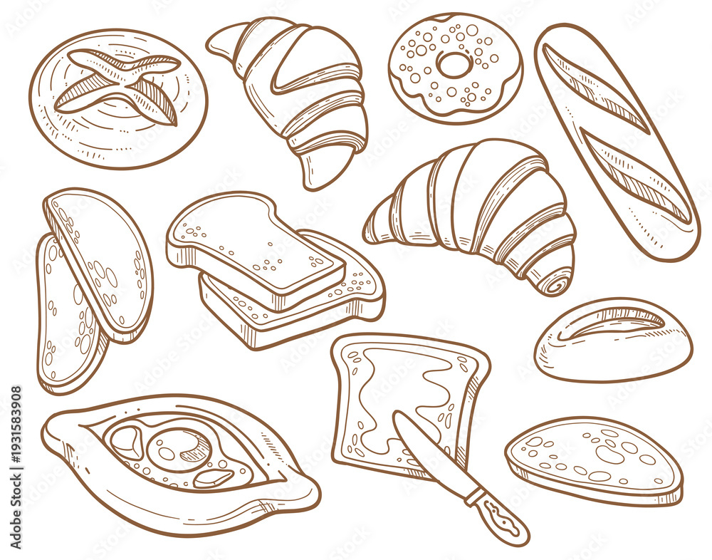 Set of illustrations on the theme of bread and pastries - croissants, khachapuri, baguette, bread and butter #1931583908