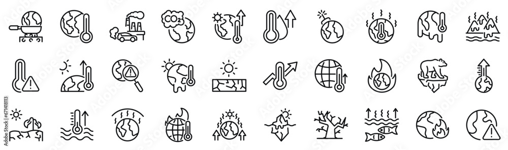 Set of 30 outline icons related to global warming. Linear icon collection. Editable stroke. Vector illustration #671418113