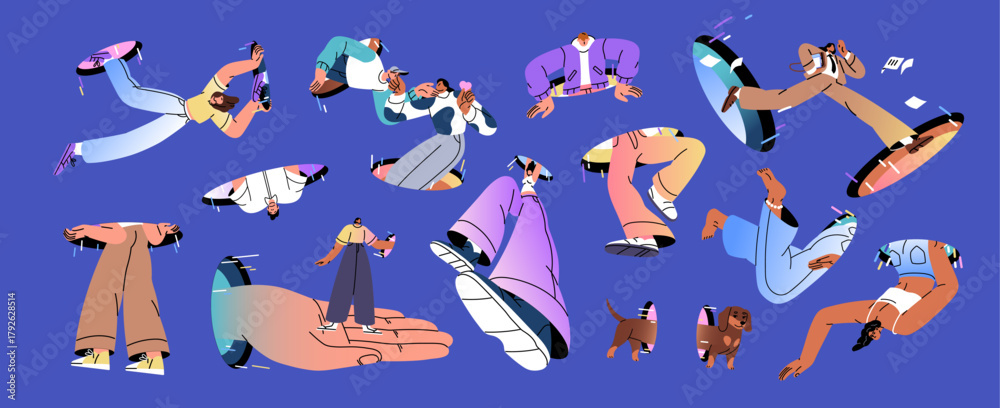 Set of people falling and flying through magic holes. Characters are jumping inside and outside teleports. Men and women find out portals and coming, peeking out. Flat isolated vector illustrations. #1792628514