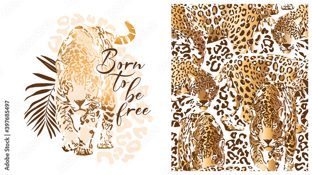 • #397685497 Set of print and seamless wallpaper pattern. Graceful leopard and exotic palm leaf. Born to be free - lettering quote. Textile composition, hand drawn style print. Vector illustration.