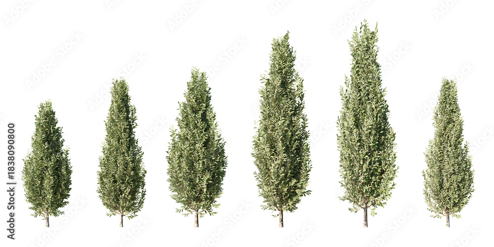 Set of pyramidal European hornbeam columnar trees at different heights, isolated on light green background for architectural visualization and landscape design #1838090800