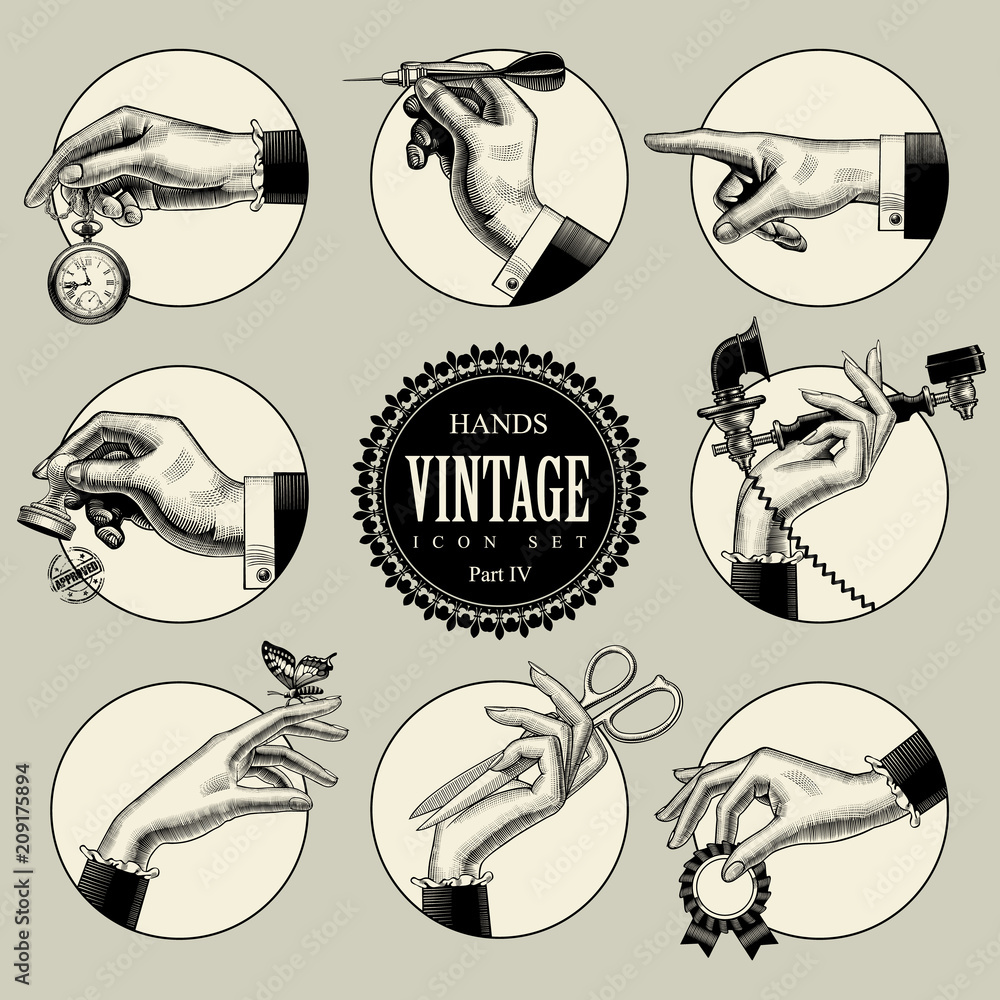 Set of round icons in vintage engraving style with hands and accessories #209175894