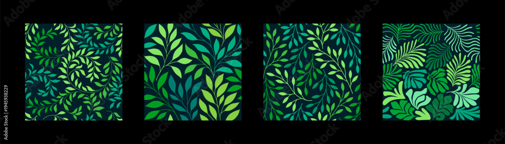 Set of seamless vector tropical leaf patterns with lush green foliage on a dark background. Ideal for wallpaper, textile, fabric, wrapping paper, packaging, stationery, home decor. #1945938229