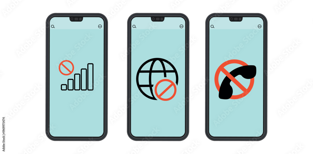 Set of smartphone screens with no connection icons, including no signal, no internet and no phone call symbols. #1969975474