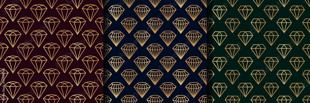 Set of three Gemstone Seamless pattern in minimal trendy style. Gold linear diamonds on a dark background. Vector #310440963