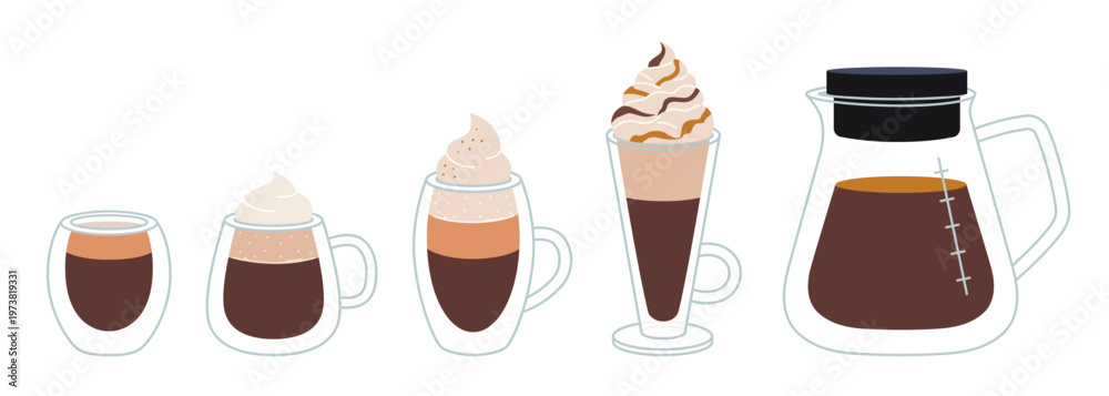 Set of various coffee drinks and drinkware. Hot beverages in Double walled glass mugs. Trendy modern vector illustration isolated on white background, hand drawn, flat design #1973819331