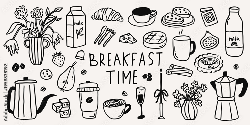 Set of whimsical card with breakfast coffee line art doodle sketch. Whimsy lunch with croissant, coffee cup, french brunch coquette. Vector whimsy outline illustration #1959838192
