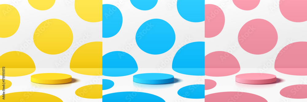 Set of yellow, blue, red and white 3D product podium with polka dots background. Abstract composition in minimalist design. Studio display showroom pedestal, Fashion stage showcase mockup wall scene. #1718935072