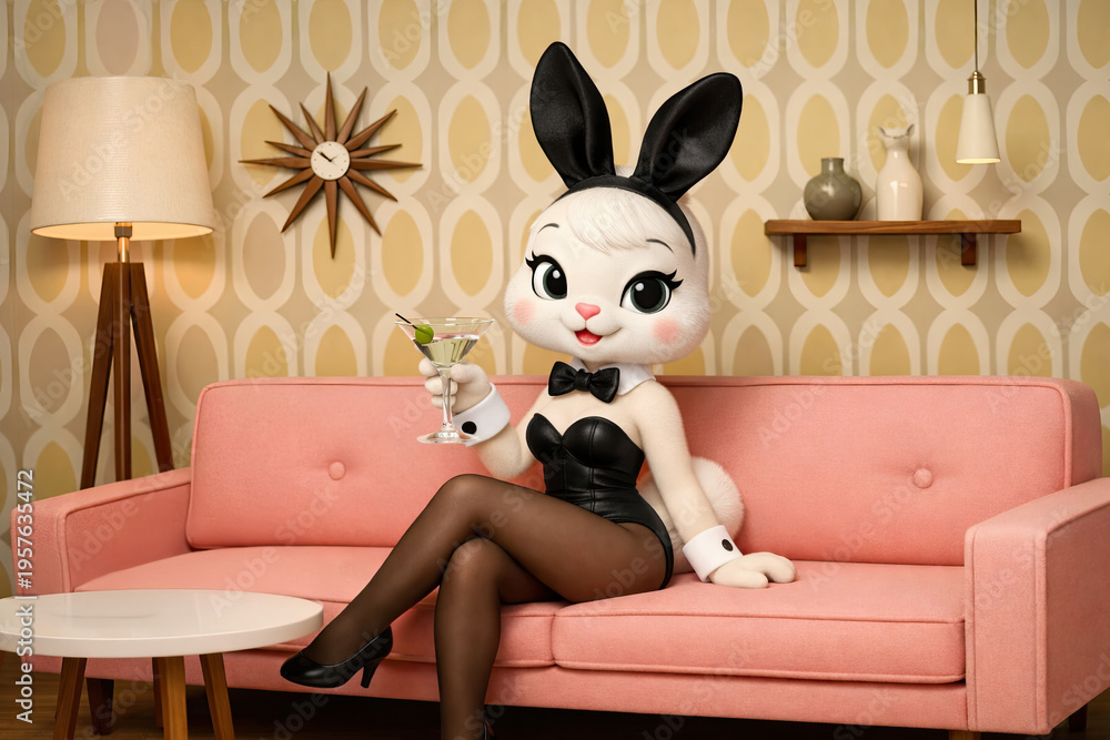 Sexy 1950s Easter Bunny Drinking a Martini on a Retro Couch #1957635472