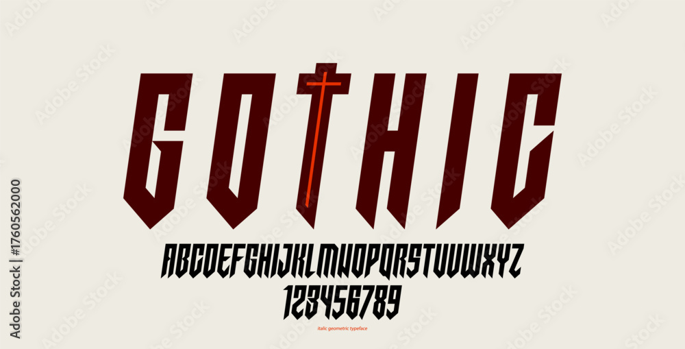 Sharp and bold gothic font for logo creation of for headlines, edgy geometric modern vector typeface, heavy metal and hard rock style alphabet with numbers, italic version. #1760562000
