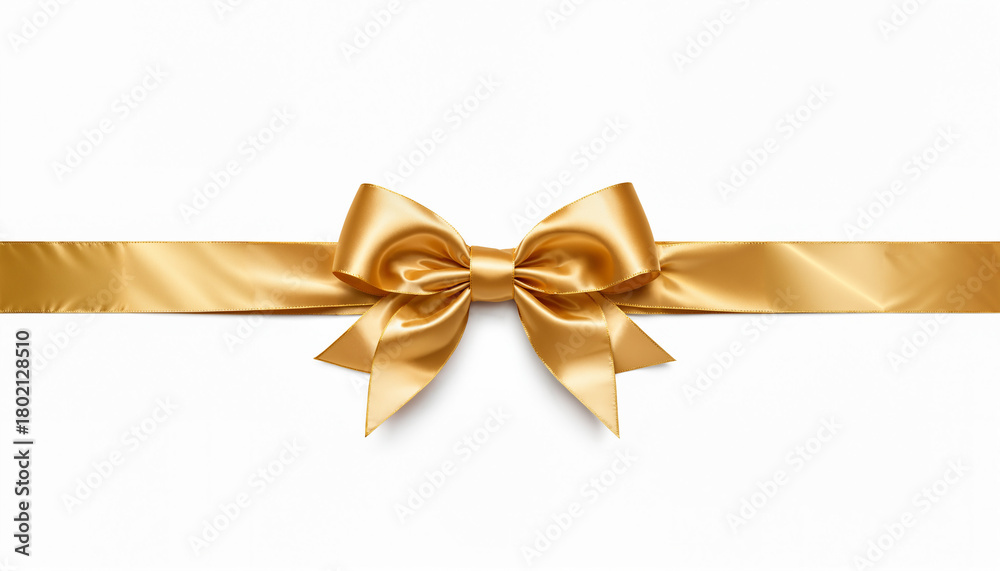 shiny gold satin ribbon bow on a plain white surface for a gift or celebration. #1802128510