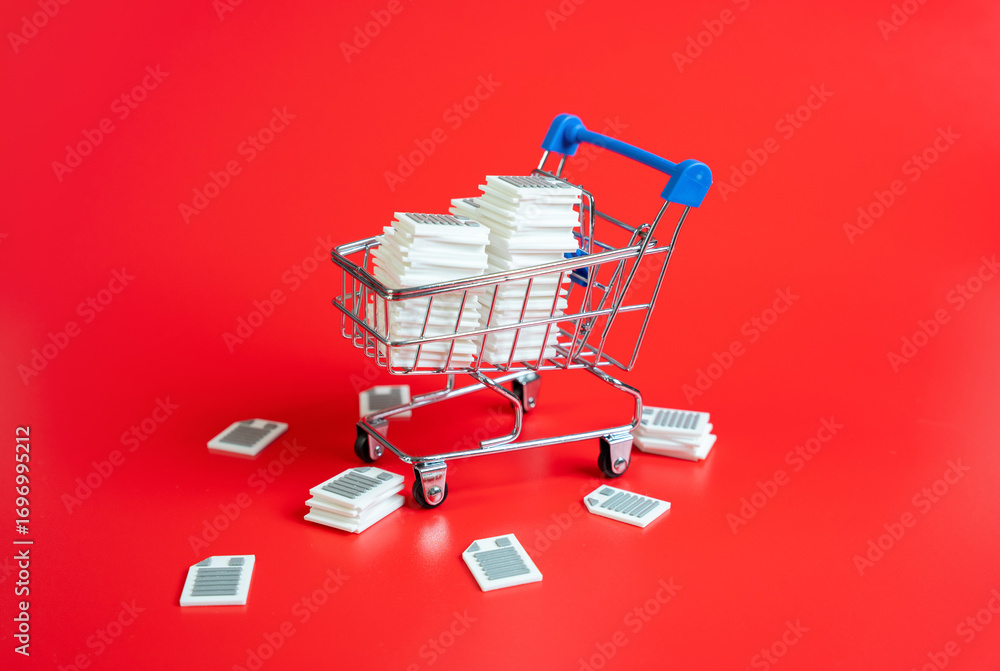 Shopping cart filled with documents and papers. Concept of excessive regulation, complex rules, and administrative barriers. Used for bureaucracy, tax policy, and compliance. #1696995212