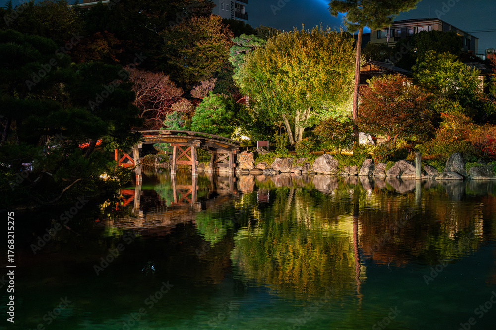 Shosei-en Garden illuminated at night during fall season. Kyoto, Japan. #1768215275