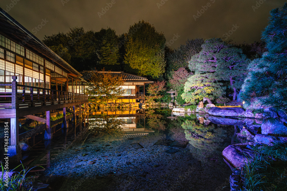 Shosei-en Garden illuminated at night during fall season. Kyoto, Japan. #1768215354