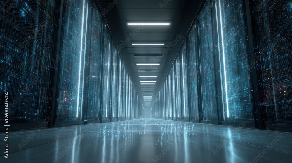 Shot of Corridor in Working Data Center Full of Rack Servers and Supercomputers with Internet connection Visualization Projection, technology, digital, futuristic, future, #1766140524
