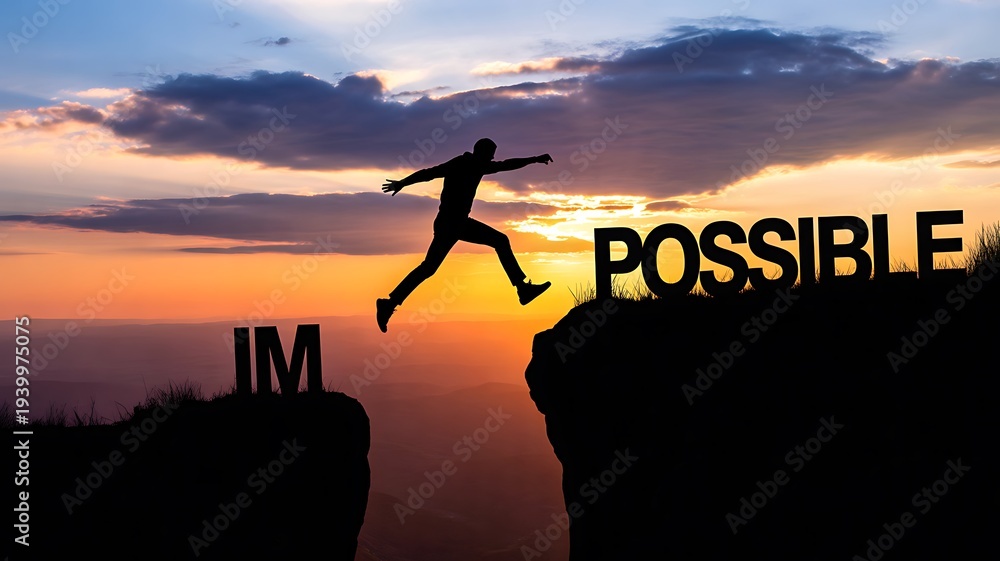 Silhouette man jumping across cliff with possible word at sunset sky #1939975075