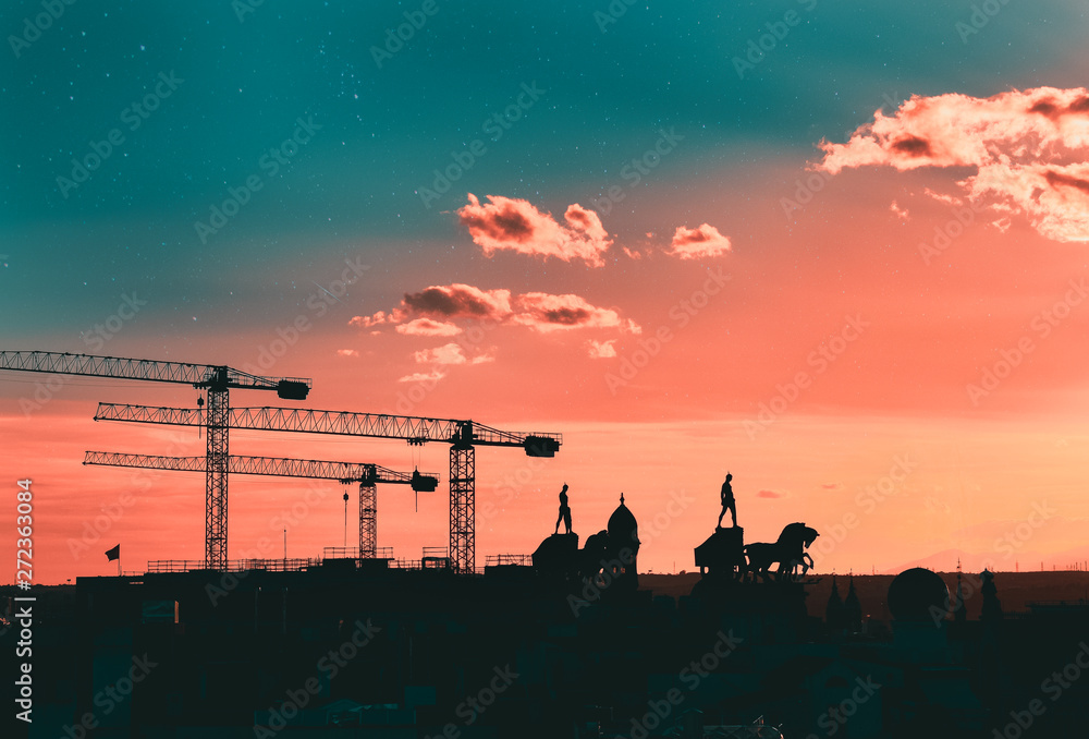 Silhouettes of cranes, statues and buildings of madrid, with a creative star sky of coral and teal color. Madrid, Spain #272363084