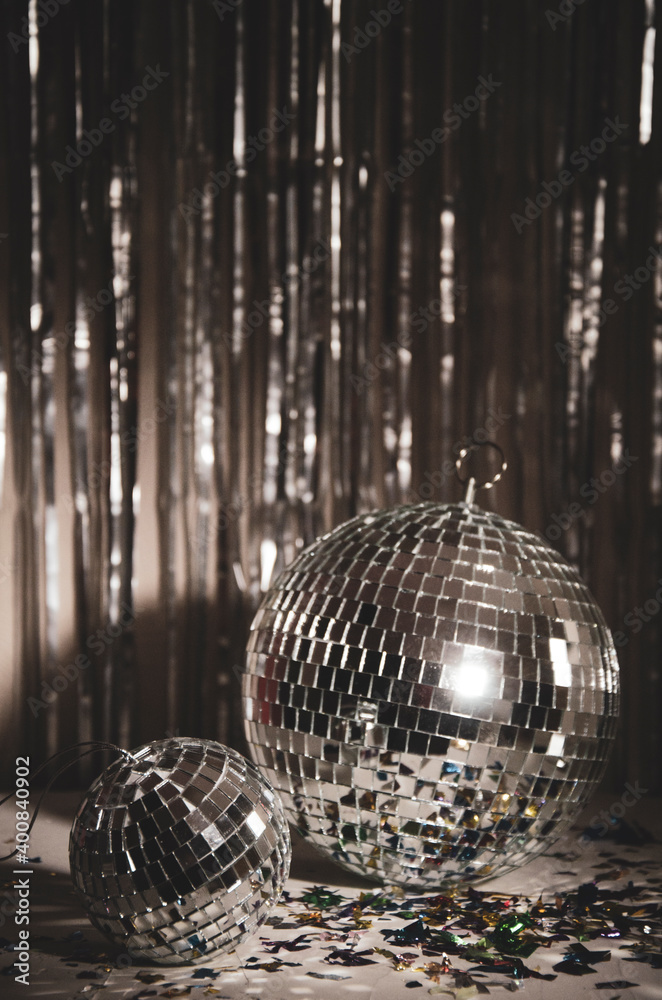 Silver Disco ball, star confetti, silver and gold metallic background. #400840902