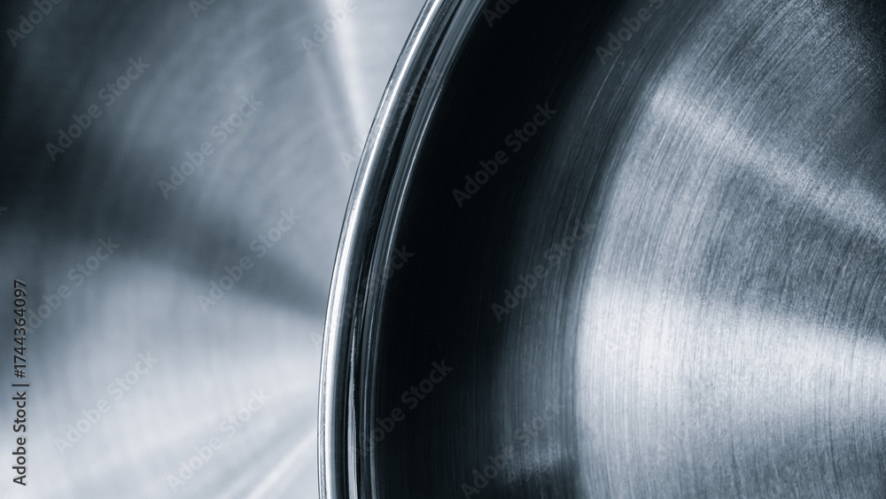 Silver frying pan with black rim. The frying pan is shiny and has a smooth surface as abstract metallic texture background for web banner template page #1744364097