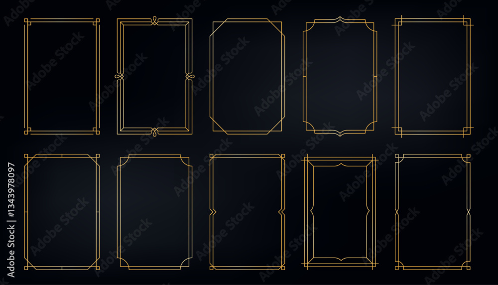 Simple golden frames. Thin luxury gold borders for wedding invitation card, modern geometric art deco frame elements. Vector elegant set #1343978097