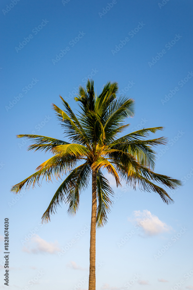 Single coconut palm tree against a clear blue sky #1828674030