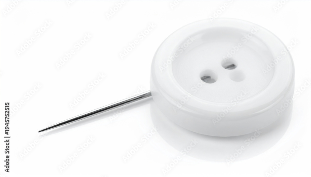 Single sewing needle inserted into a white three-hole button on a white background #1945752515