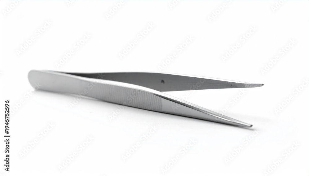 Single stainless steel precision tweezers angled on a plain white background #1945752596