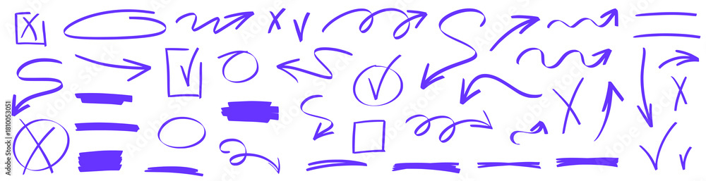 Sketchy arrow icons mixed with underline marks, textured marker lines and vivid highlight strokes. Each arrow blends underline with marker contrast and highlight brush softness. #1810053051