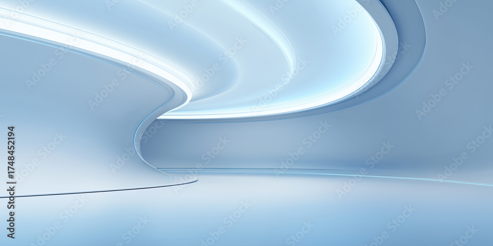 Sleek contemporary architectural interior defined by flowing lines, smooth curves and cool blue tones. Minimalist design creates calming sense of space, modern elegance and futuristic sophistication. #1748452194