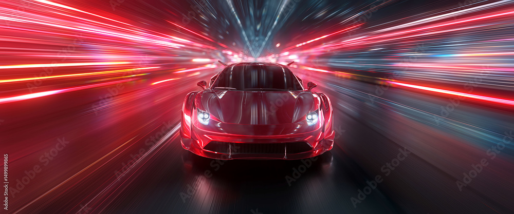 Sleek red sports car racing at high speed on neon highway. Power acceleration on a night track with colorful lights. Futuristic digital background. Concept of velocity and technology. 3d illustration #1499899865
