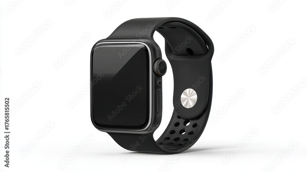 smart watch mockup with black strap, png file of isolated cutout object with shadow on transparent background. Black and digital screen #1765815502