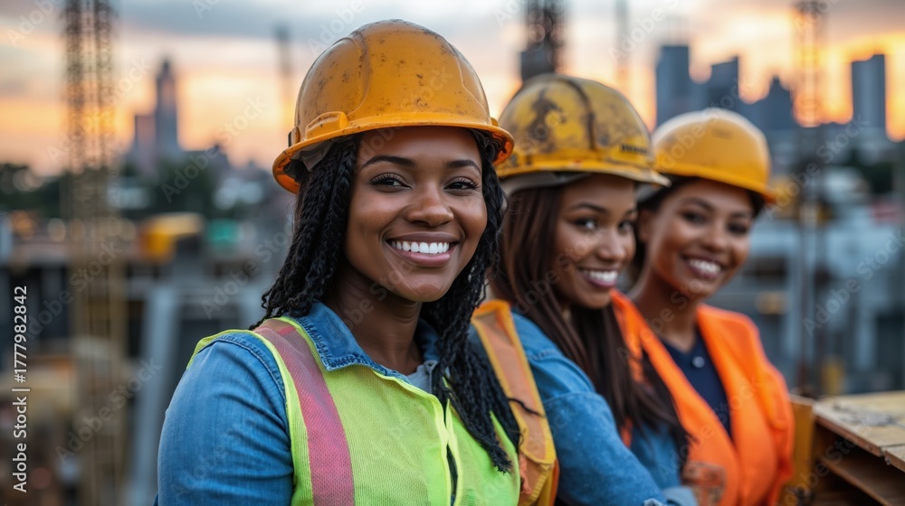 Smiling construction workers in safety gear, portrait of african women at an urban building site during sunset #1777982842