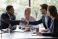 Smiling diverse businesspeople shake hands get acquainted greeting at team meeting in office. Happy multiracial male colleagues employees handshake at briefing with coworkers. Acquaintance concept. #377660547