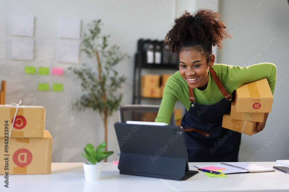 Smiling young woman engaging in a video call on a tablet while holding a package in her office. #1948233904