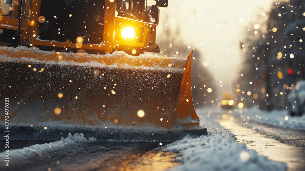 Snowplow clearing road while snow falls in winter evening light #1770497031