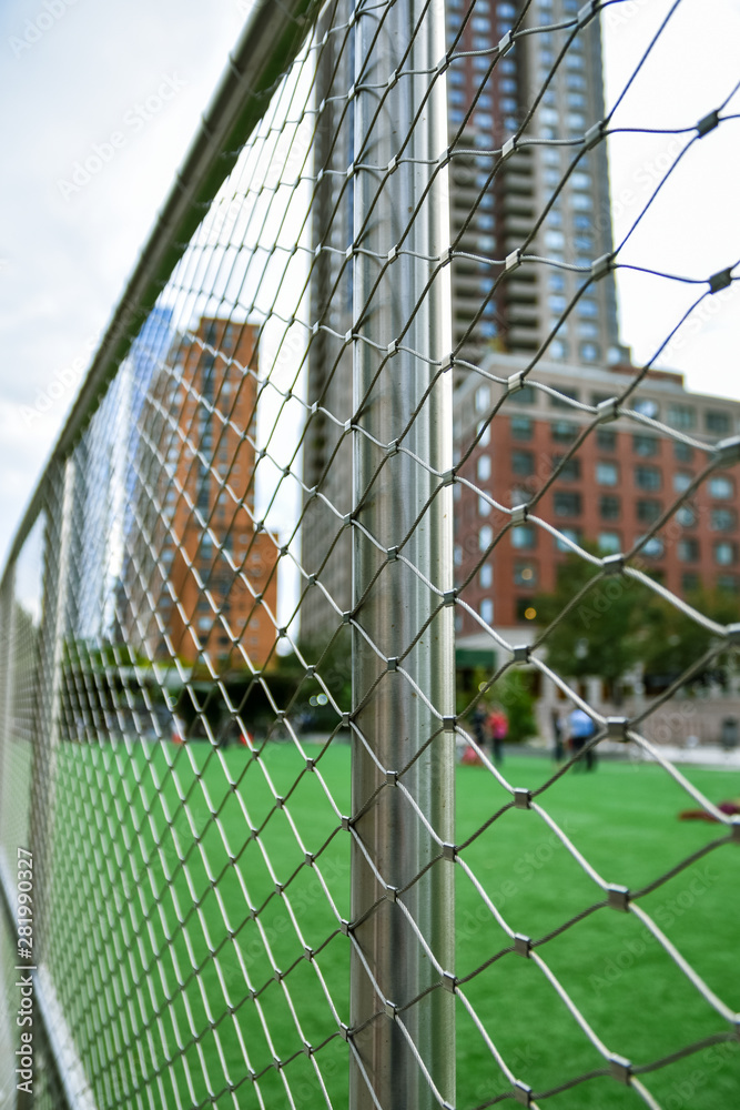 Soccer field concept out of focus in the city of NYC., Manhattan, between skyscrapers. Fence in the foreground focused. #281990327