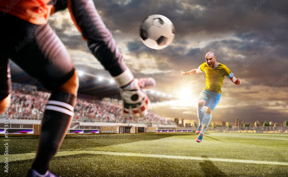 Soccer players in action on the sunset stadium background. Panorama. Sports concept. Football players. The decisive match. Soccer championship. #1793515828
