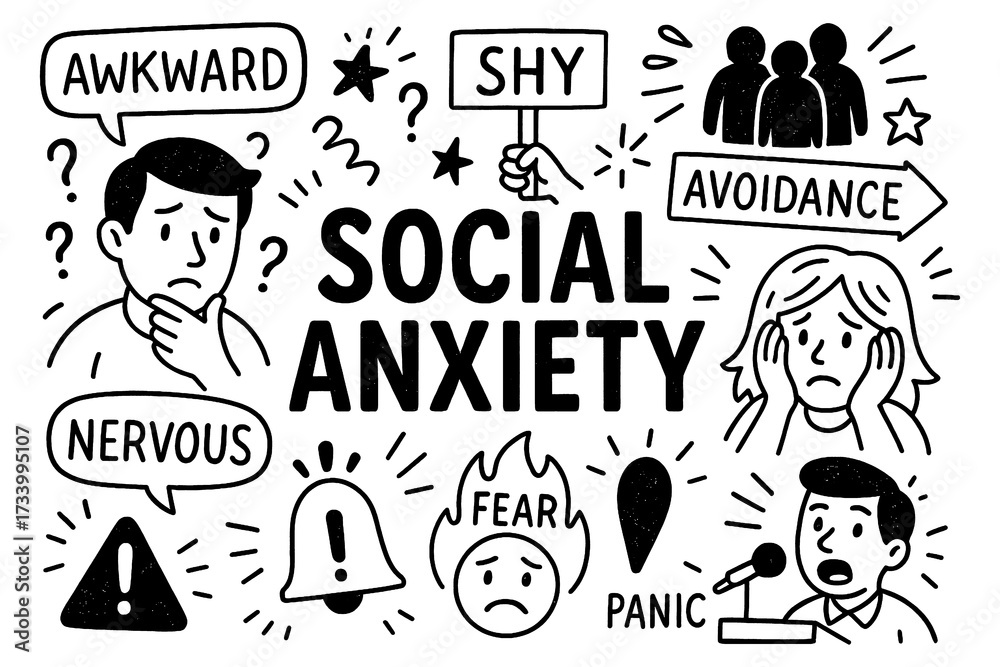social anxiety concept with nervous faces, avoidance symbols and doodle style icons, Transparent Background #1733995107