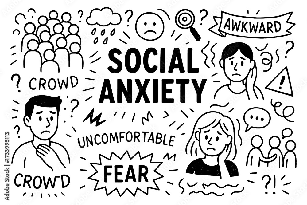 social anxiety concept with nervous faces, avoidance symbols and doodle style icons, Transparent Background #1733995113