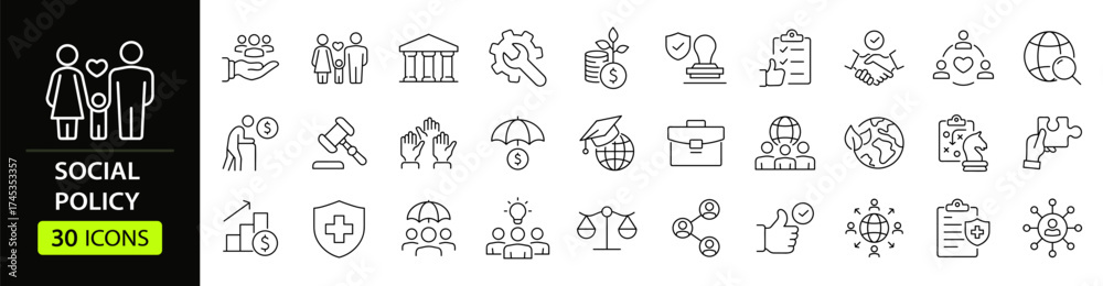 Social policy Web Icon Set in Line Style. Collection of Social services Linear Icons, Including, healthcare, family, education, protection, law, insurance, healthcare, reform and more. Editable Stroke #1745353357