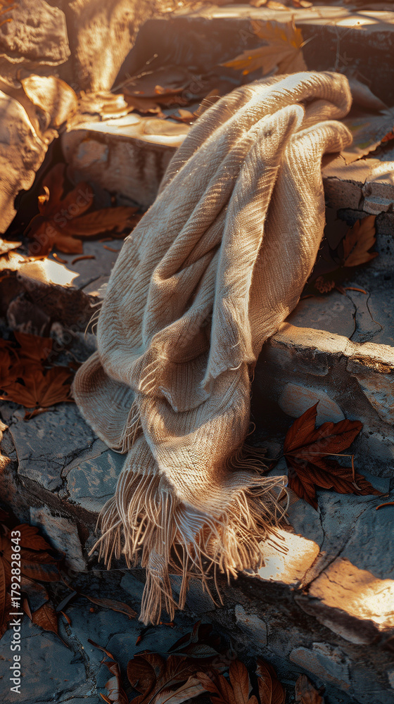 Soft beige blanket draped over stone steps surrounded by autumn leaves #1792828643