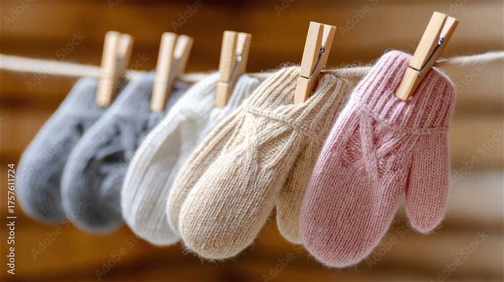 Soft knitted baby mittens hanging on clothesline outdoors, concept of childhood, warmth and family care. #1757611724