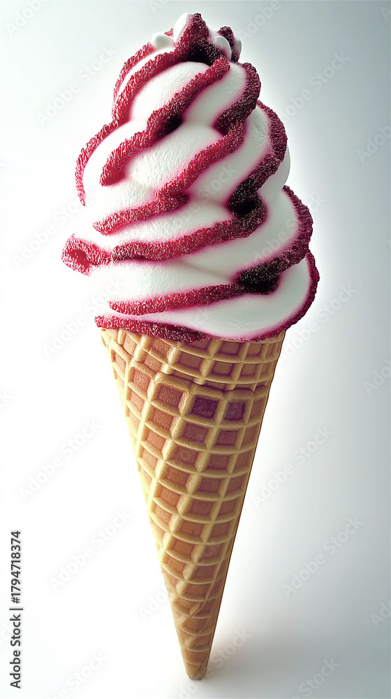 Soft serve ice cream with bold strawberry syrup swirl in crispy cone, isolated on white background. Clean mockup design with vertical format and copy space. #1794718374