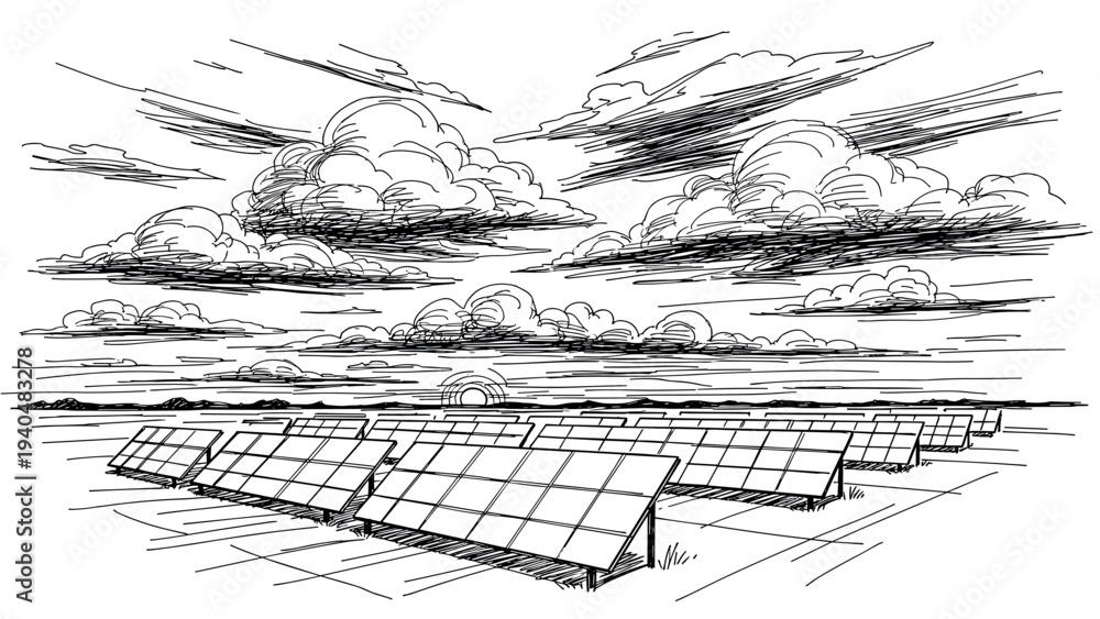 Solar panels in a scenic landscape with dramatic clouds and sunset in sketch style #1940483278
