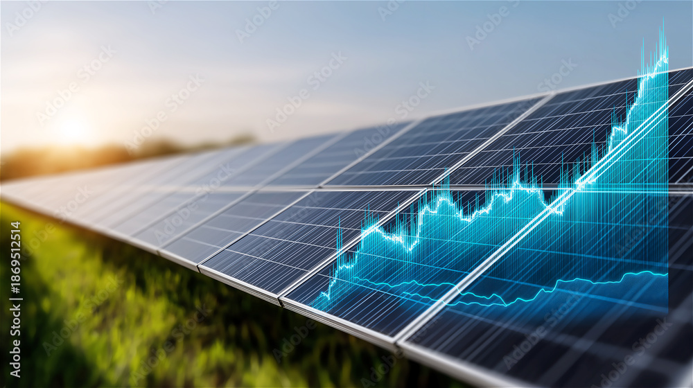 Solar panels in sunlight with rising chart overlay, symbolizing renewable energy investment and sustainable growth. Clean technology finance concept for future power and ESG. #1869512514