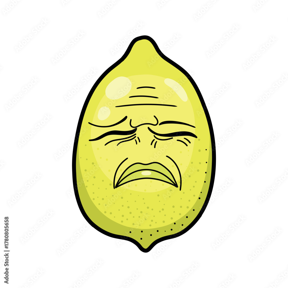 Sour lemon emotion mascot logo. Lemon on a white background. Black outline with a sour face. Caricature of a sour taste. Wrinkled face with closed eyes. Cartoon flat style. #1780805658