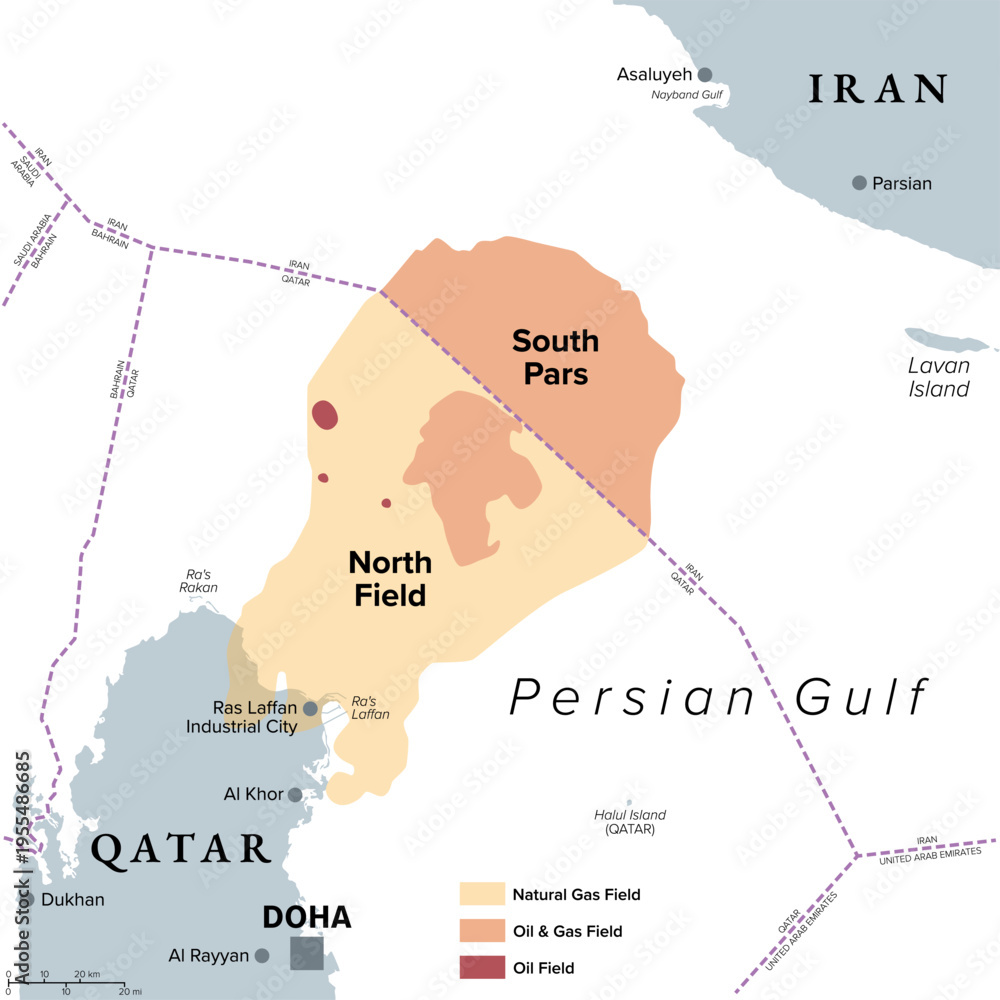 South Pars/North Dome field, political map. Natural-gas condensate field located in the Persian Gulf, with shared ownership between Iran and Qatar. Largest natural gas field in the world. Vector #1955486685