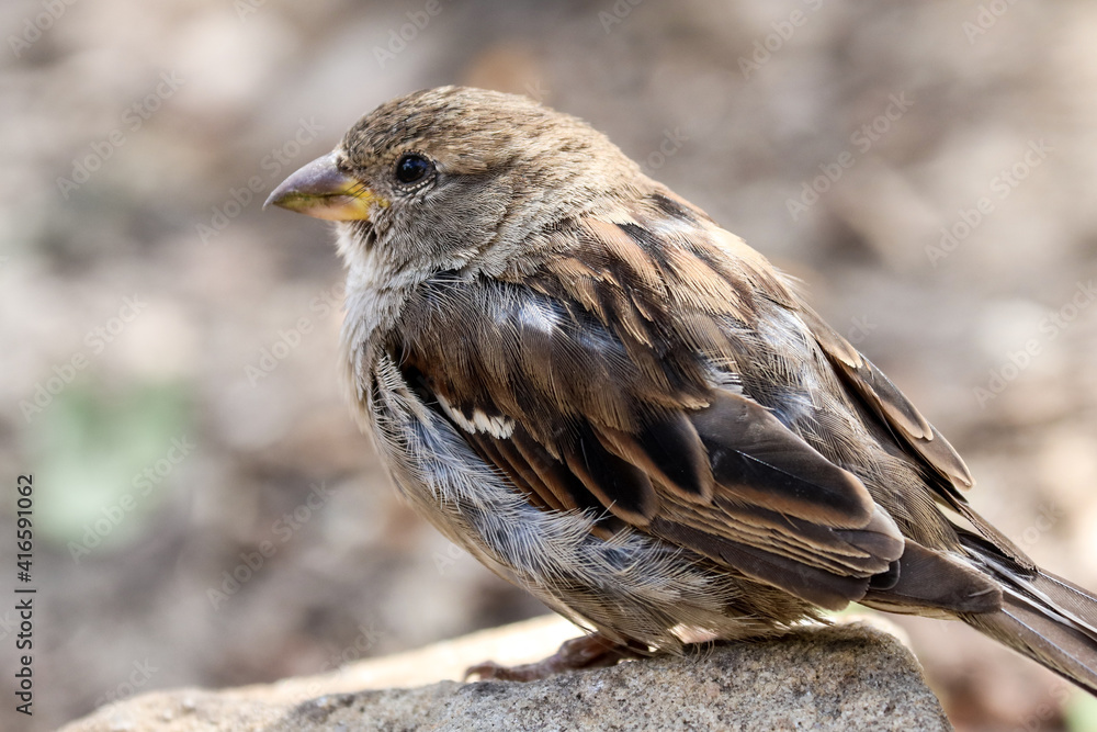 Sparrow bird perched sitting on rock. Sparrow songbird (Passer domesticus) sitting and singing on stone rock close up photo with out of focus clean brown simple background. Bird wildlife scene. #416591062